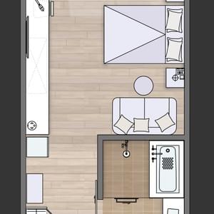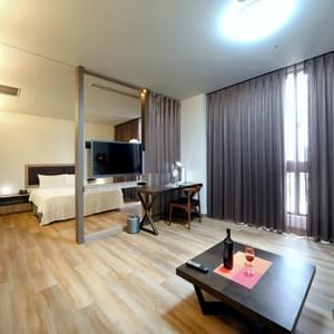 The room features a 180 x 210 cm King Size bed, combined with a high-quality mattress to provide an ultimate relaxing sleep; complete modern audiovisual equipment and smooth space planning enhance the overall comfort and ease of use.