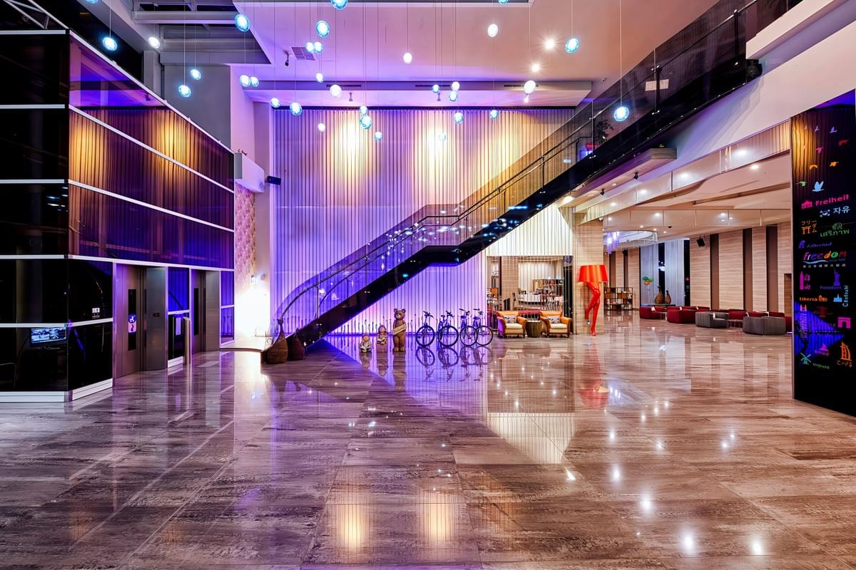 The hotel features modern design elements, boasting a grand lobby with a height of 9 meters, which is bright, airy, and spacious, alongside a variety of public facilities and approximately 500 ping of outdoor leisure green space, ideal for relaxation and providing a perfect space for family activities.